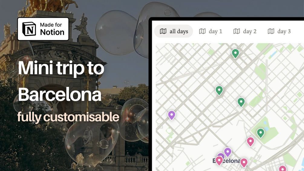 What is This Template? This Notion template is your comprehensive guide to spending three unforgettable days in Barcelona. Complete with a color-coded map and a detailed itinerary, it simplifies your travel experience by providing all the information you need at your fingertips. It even includes a pre-filled dataset of the best vegan restaurants in the city.