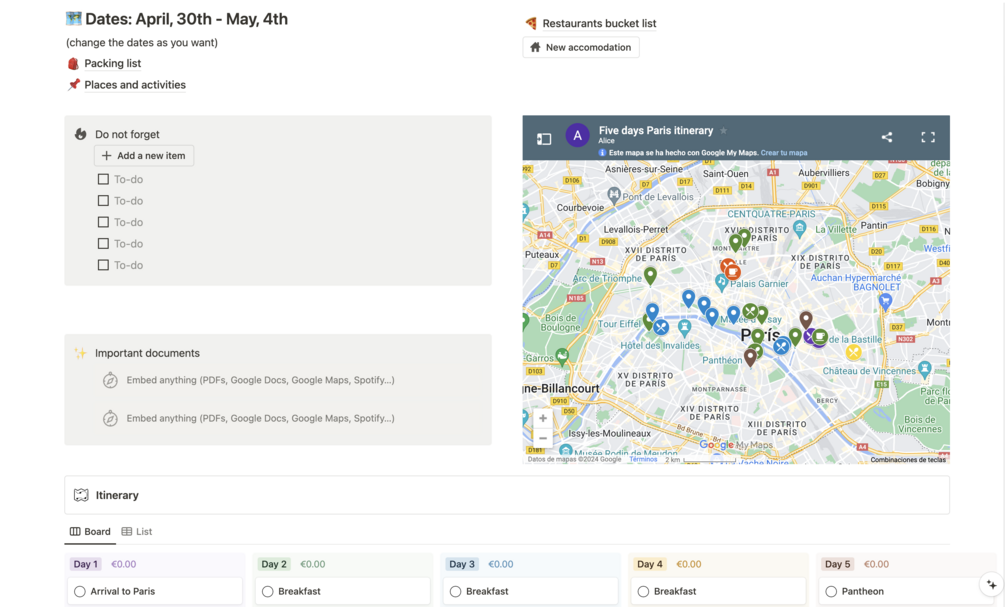 What is This Template? This Notion template is your comprehensive guide to spending five unforgettable days in Paris. Complete with a color-coded map and a detailed itinerary, it simplifies your travel experience by providing all the information you need at your fingertips. It even includes a pre-filled dataset of the best vegan restaurants in the city.