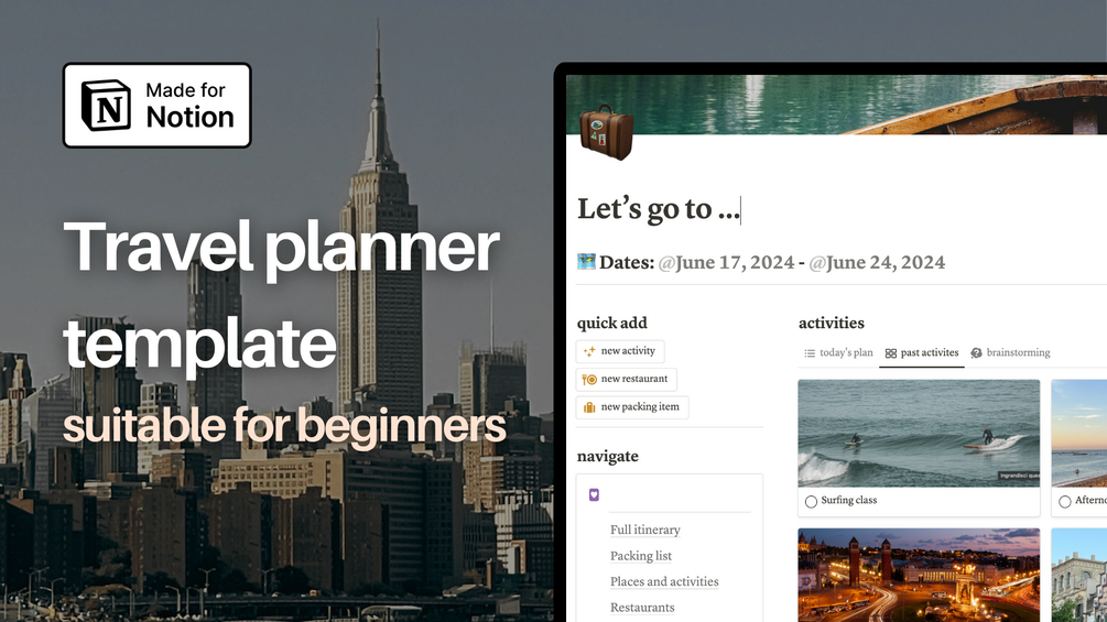 The Travel Planner Template is a comprehensive Notion-based tool designed to help you organize and manage your travels effortlessly. With dedicated sections for activities, restaurants, accommodations, and packing lists, it ensures you have everything you need at your fingertips.